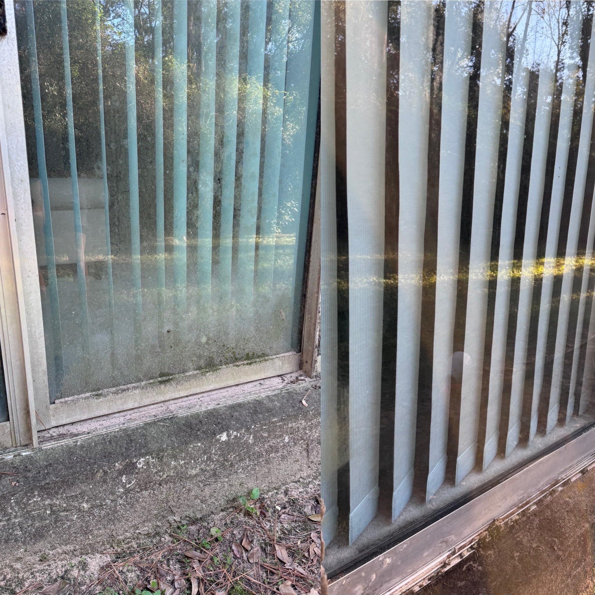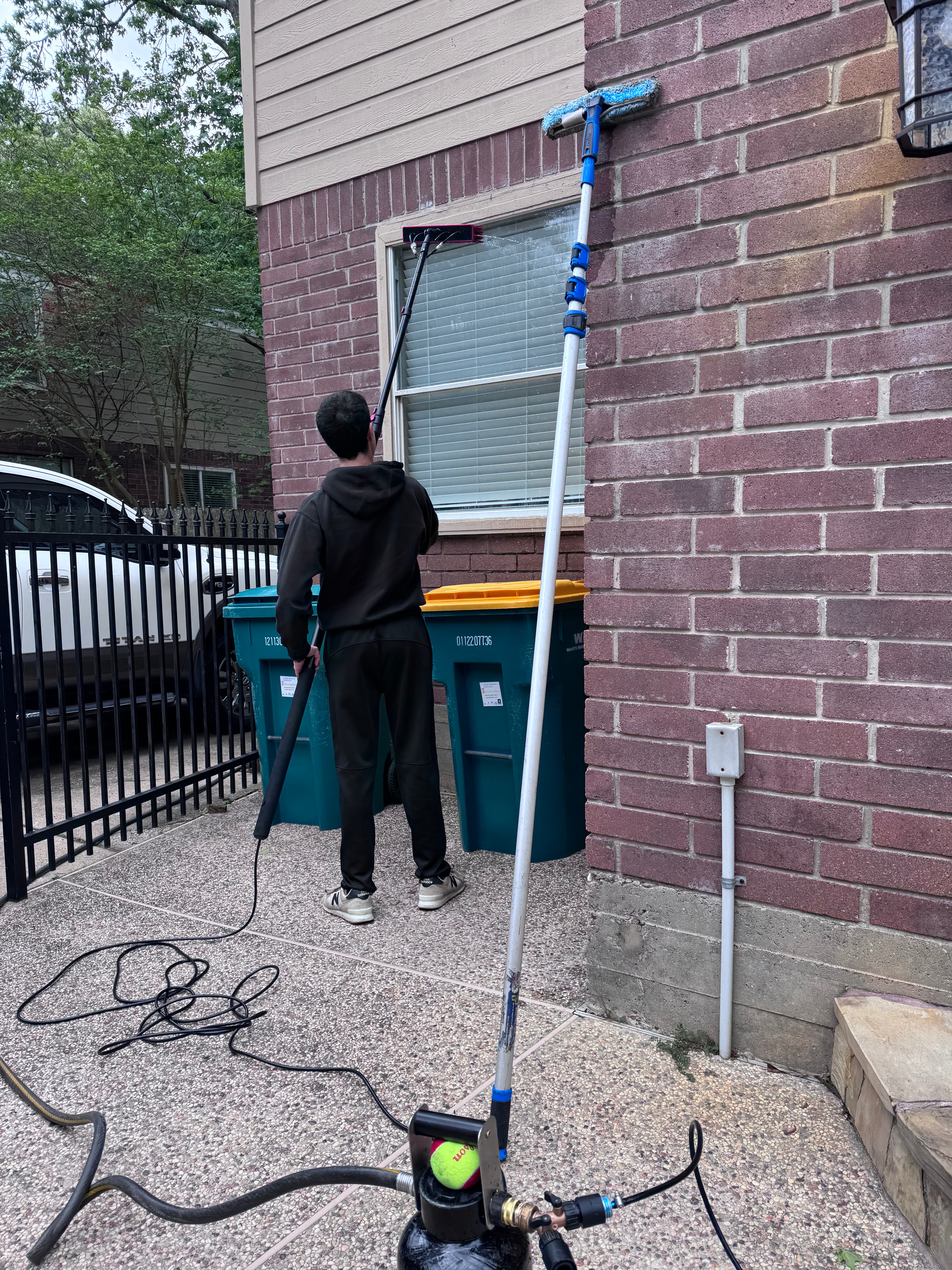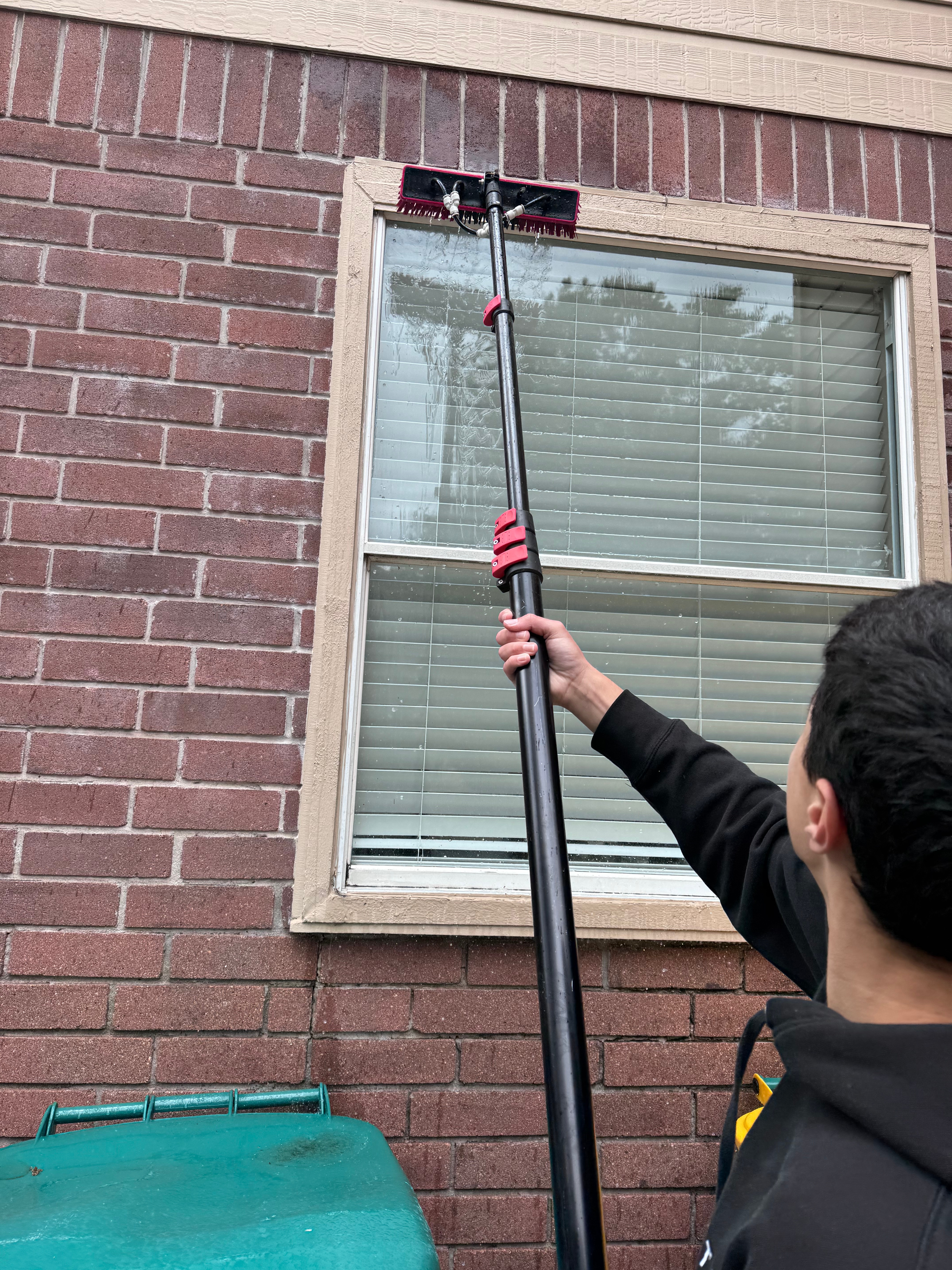 We start by gently soft-washing the windows with a high-quality soap solution, ensuring a thorough but safe clean. Next, we scrub the frames to remove dirt and buildup, then rinse everything with purified DI (deionized) water for a spotless, streak-free finish.