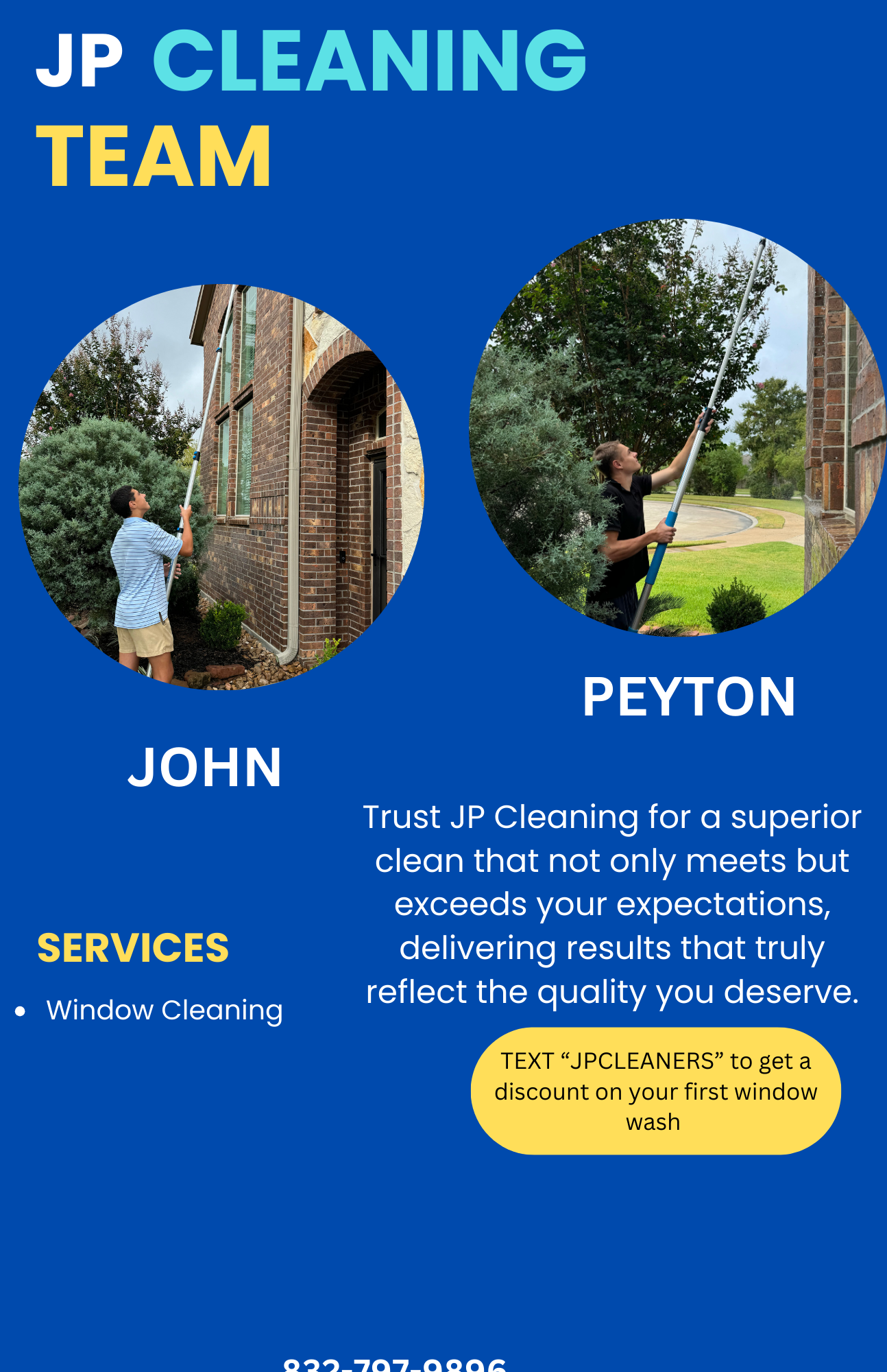 If you need an exterior window washers JP cleaners are the best company that’s done our windows. Peyton and John 2 high schoolers. They did it a month ago and they are STILL CLEAN!